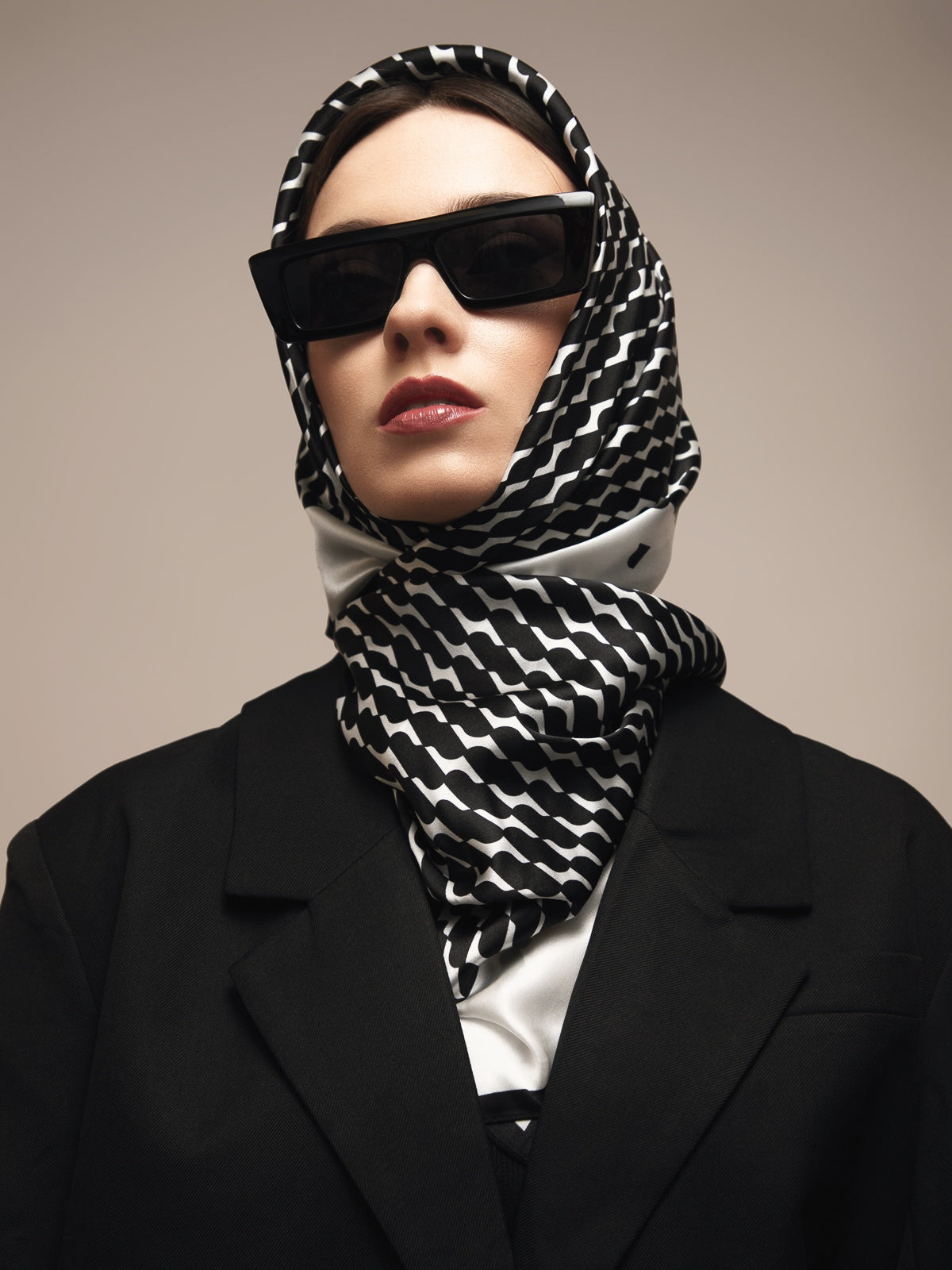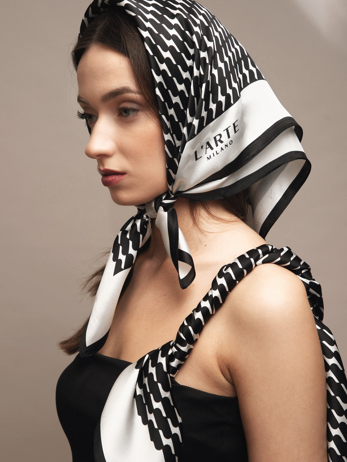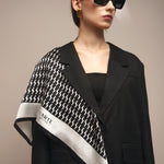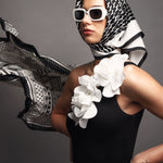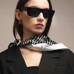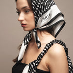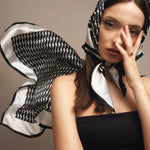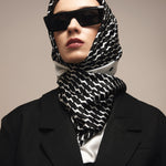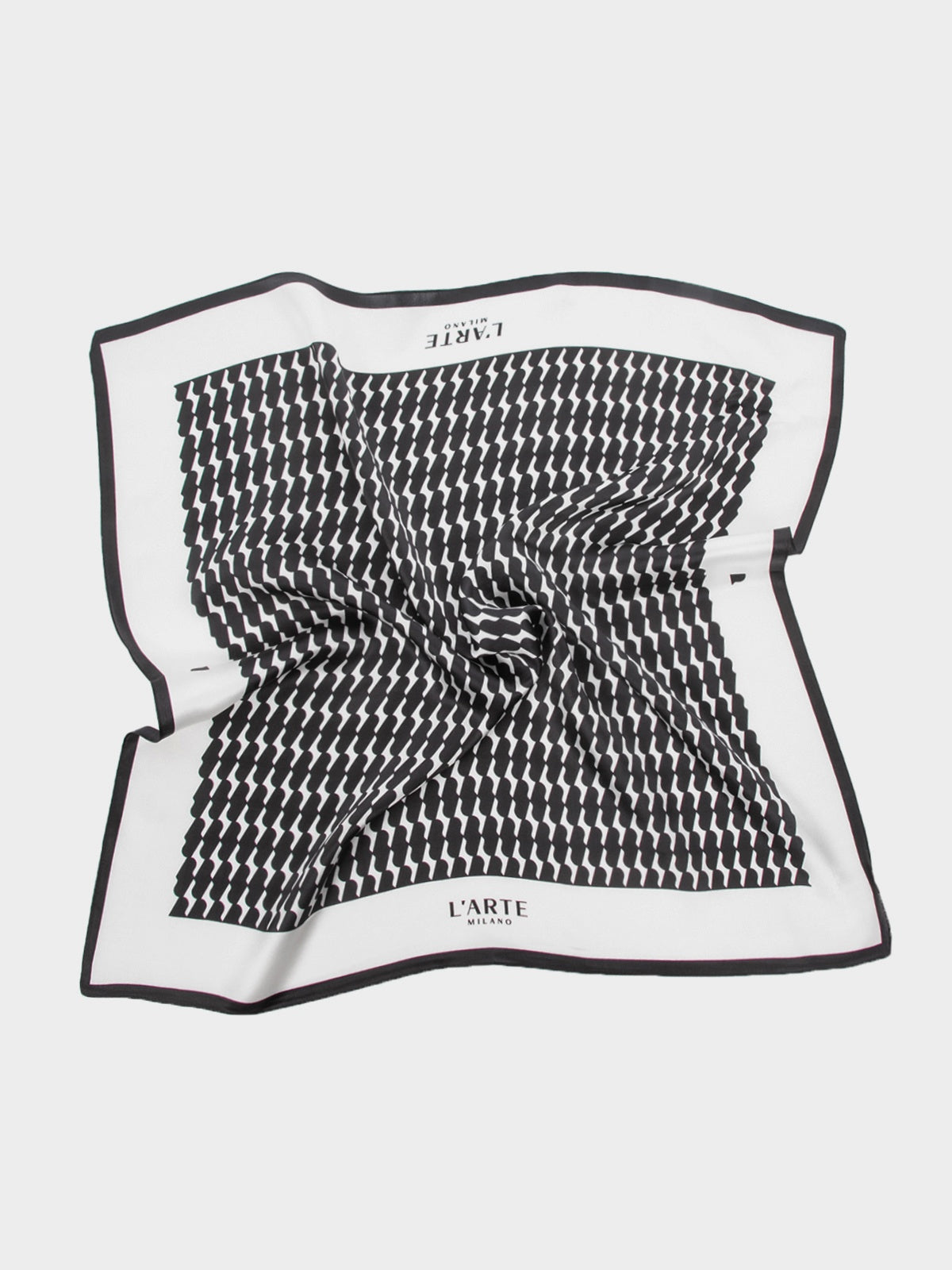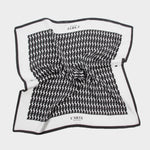 Sudėtis: 100% šilkas.Spalva: juoda/balta. Išmatavimai: 70x70 cm.