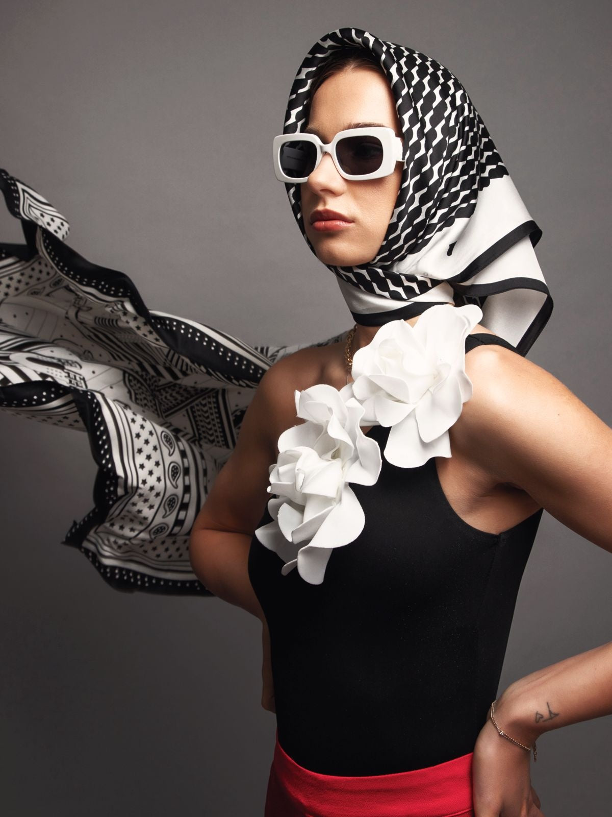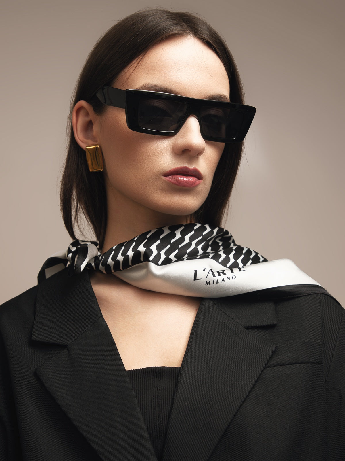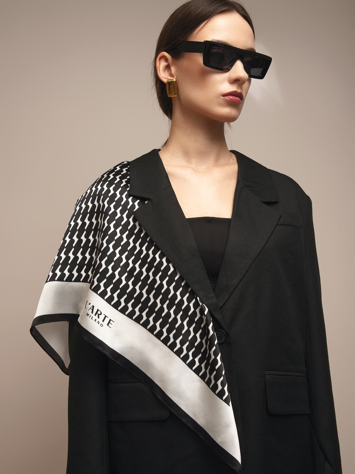 Sudėtis: 100% šilkas.Spalva: juoda/balta. Išmatavimai: 70x70 cm.