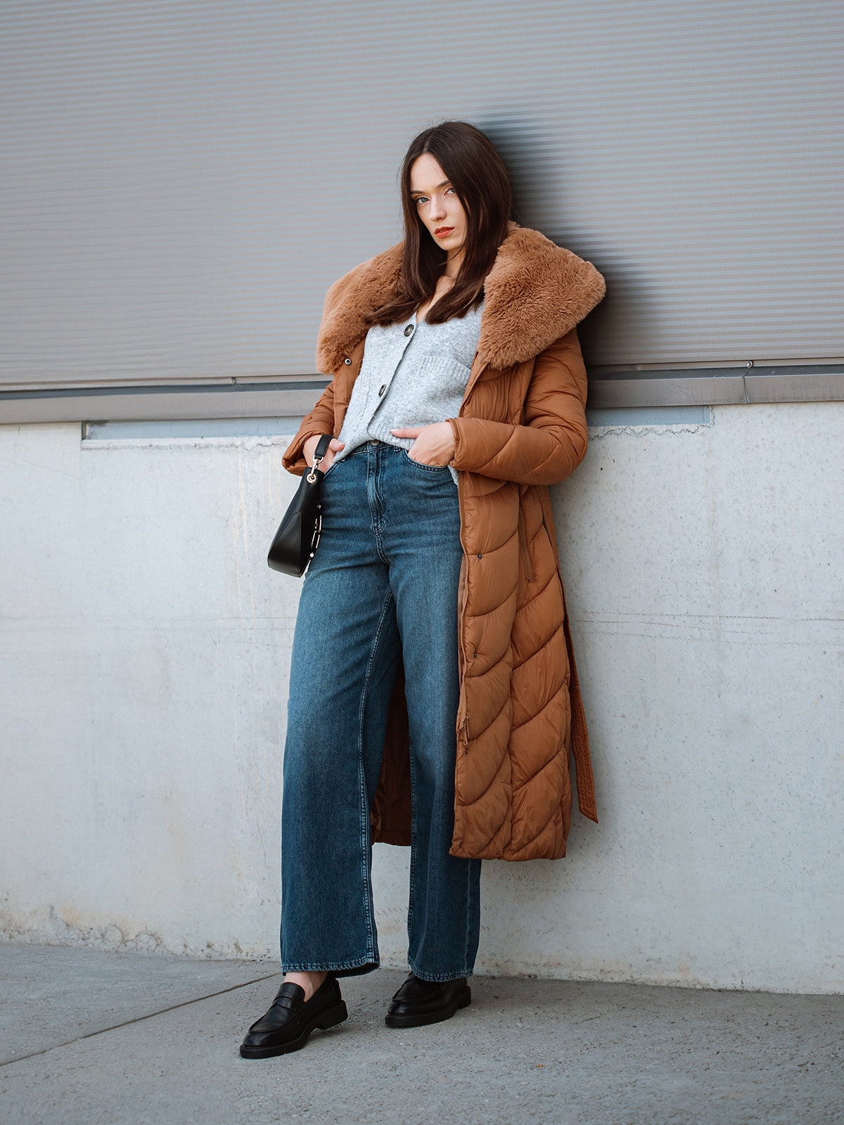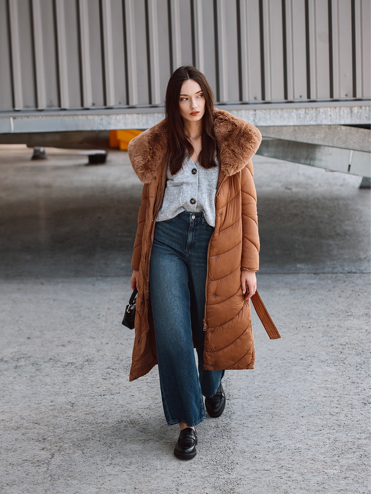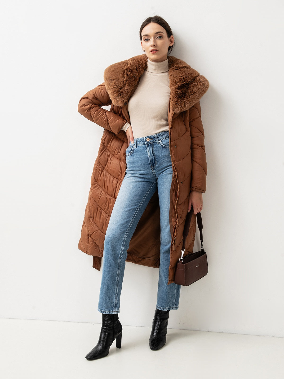 Nusegama apykaklė dekoruota dirbtiniu kailiu.