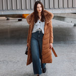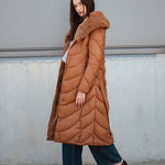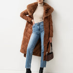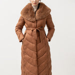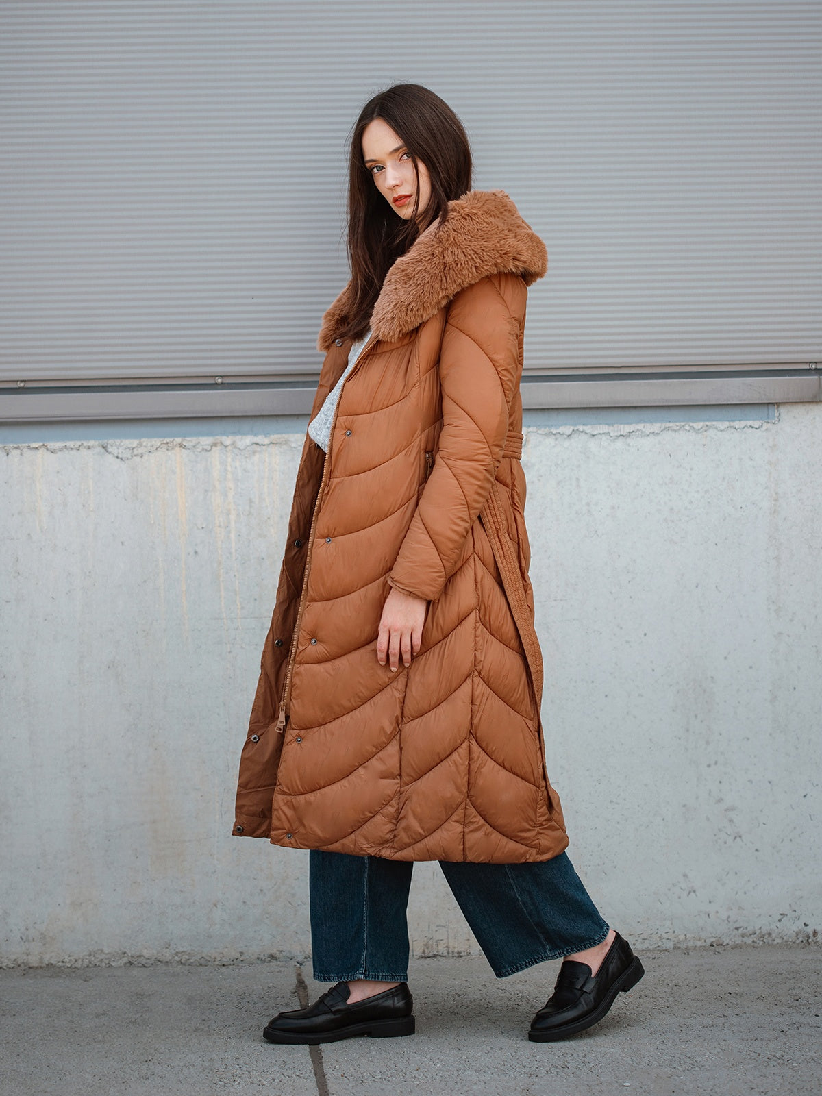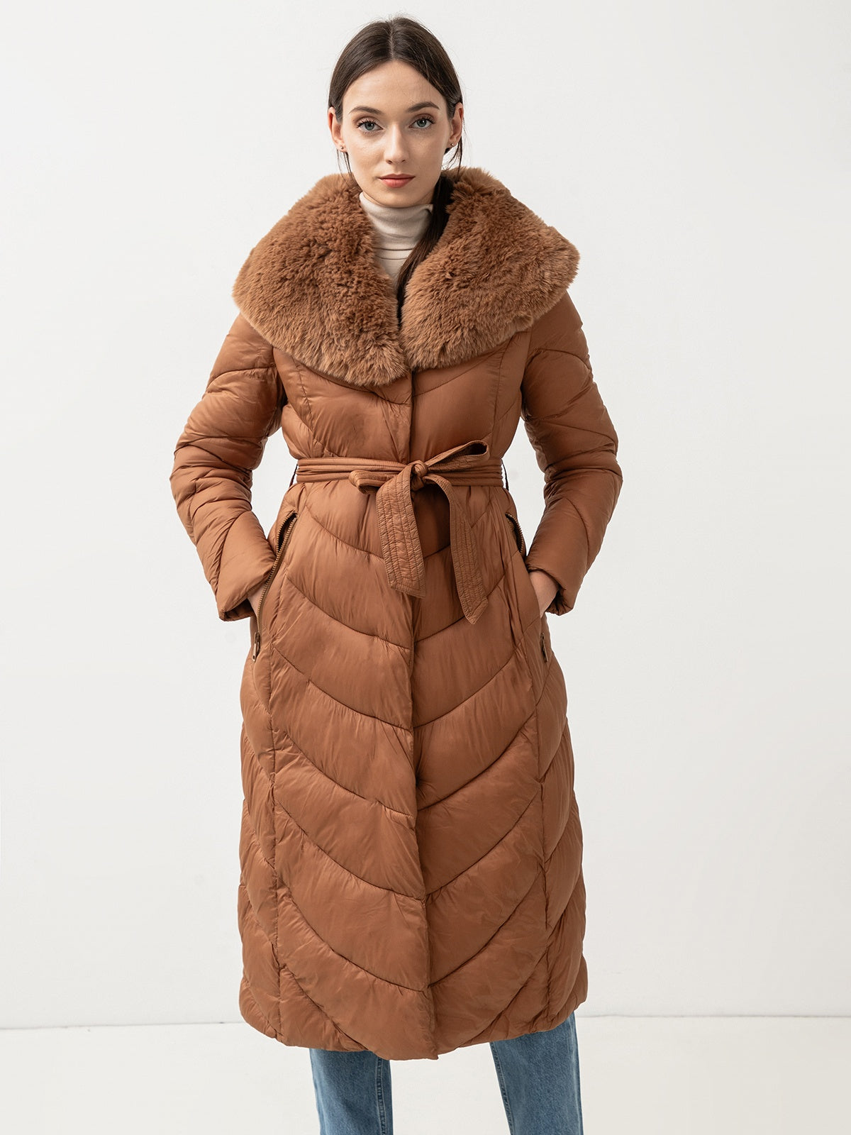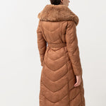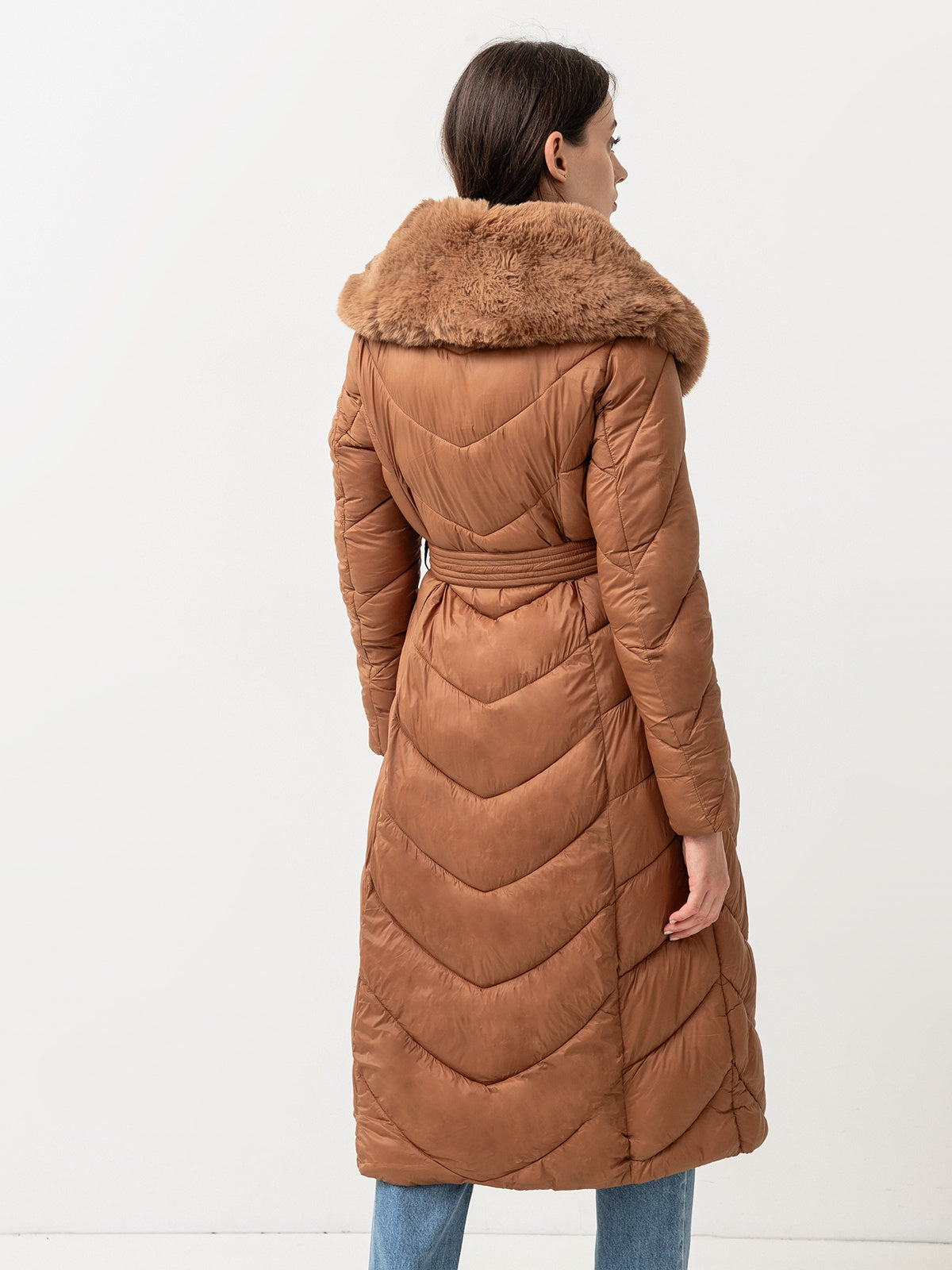 Nusegama apykaklė dekoruota dirbtiniu kailiu.